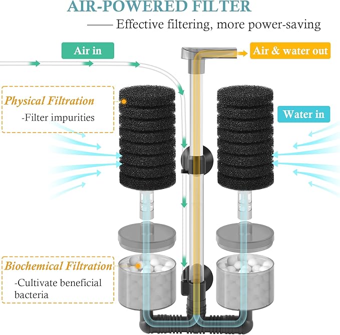 - Ultra-Quiet Air Powered Filter: This aquarium sponge filter needs to be connected with an air pump to drive the filtration process (air pump is not included in the package). Airflow will drive the water to flow through the filter material, thereby achieving the filtration effect, which is more power-saving. Moreover, when the filter is in operation, only the sound of water flow can be heard, without the noise of the motor, making it very quiet.