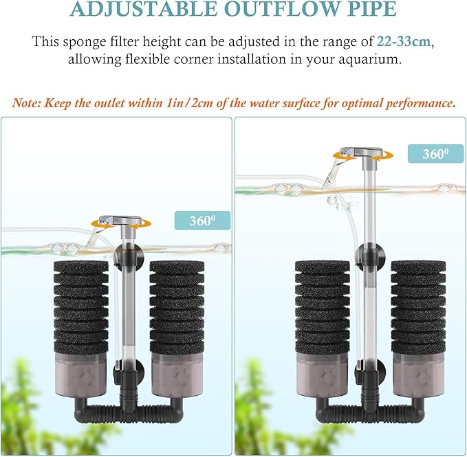- Adjustable Filter: Easy to adjust the height of the filter with the telescopic water outlet pipe, and the direction of water outlet can be rotated by 360°. For different tanks, you can choose to install this fish tank filter horizontally, vertically. You can also rotate the bottom black pipe to install the filter section at different positions, which makes this bio sponge filter more convenient to use.