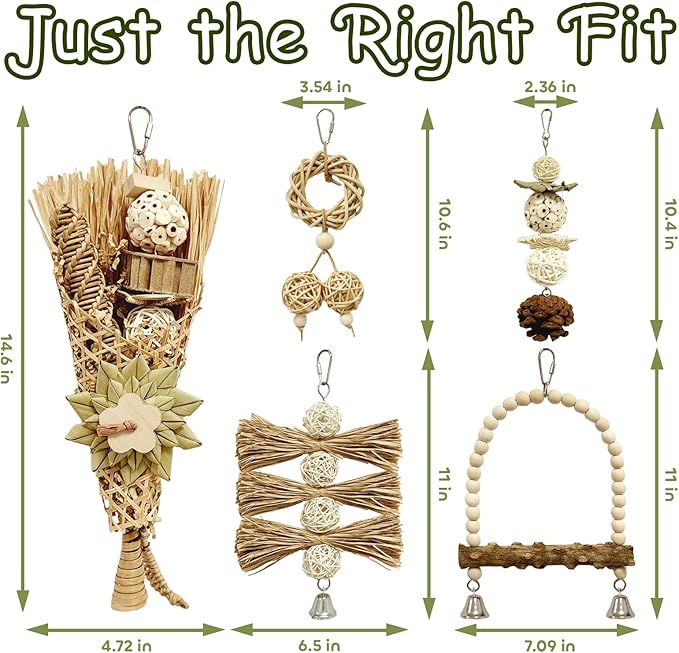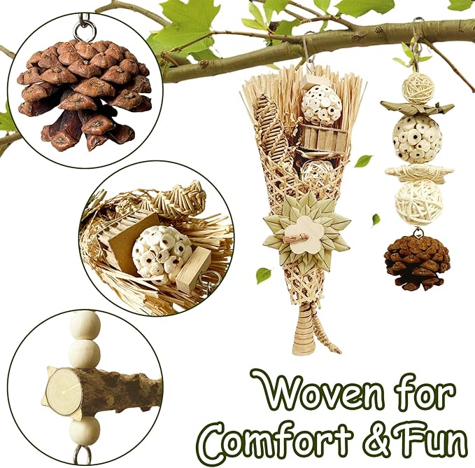 - All-Natural Materials, No Plastic or Dye: Crafted from bamboo, rattan balls, wooden beads, prickly ash wood, sola balls, pine cone, rattan column, and corn husk, this set of natural bird toys offers a safe and engaging chewing experience. No harmful chemicals—just pure nature for your bird's beak.