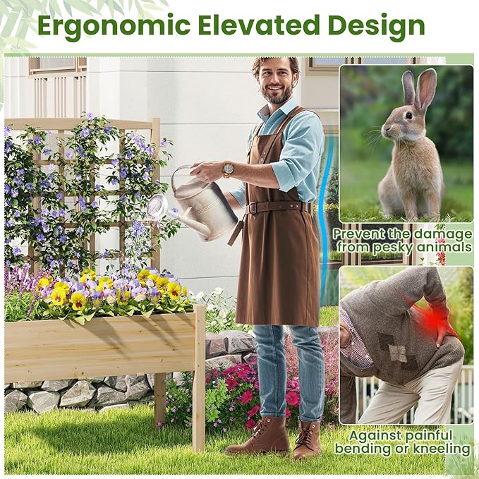 - [Versatile Integrated Trellis]: The lattice trellis of the elevated planter serves as more than just a support structure for climbing plants. It also functions as a mount rack for flower baskets and tiny ornaments, transforming your garden into an enchanting display of charm.