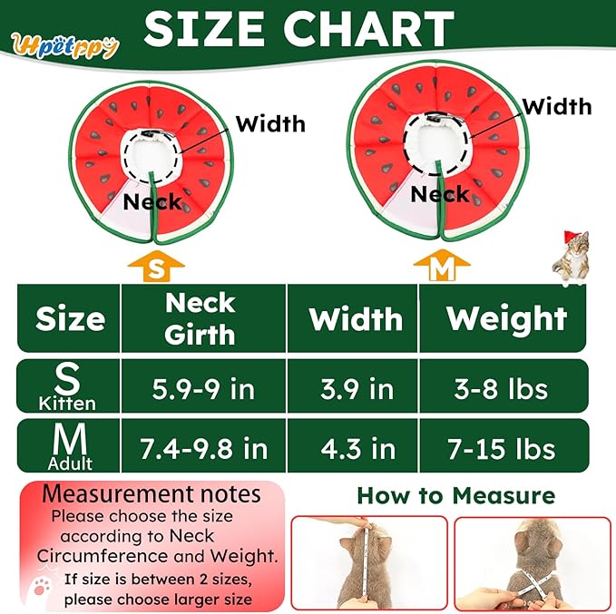 - EFFECTIVE PROTECTION: This cat cone is a perfect cone for cats after surgery. Pets often bite and lick their injured area or surgical site. We increased the diameter of the Cat cone collar soft to prevent this, even for lower limb wounds. With this collar on, the unique and cute watermelon shape makes it like a pet ornament instead of a cat surgery collar. Imagine your cat wearing it and looks like a watermelon, you both will be in a good mood all day