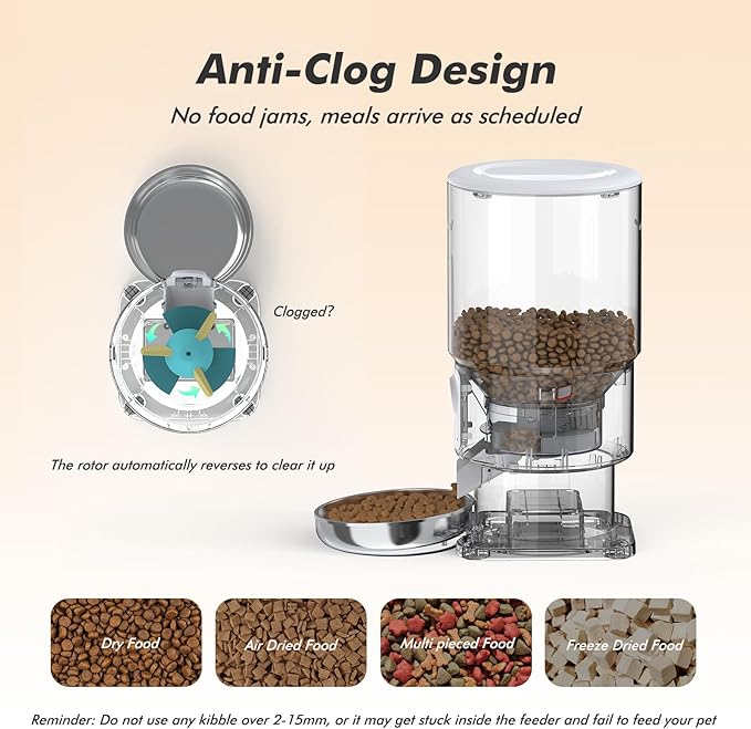 - Two-Way Audio: The timed cat feeder's built-in advanced microphone and speaker allow you to stay connected with your pet anywhere, anytime. You can call your cat and interact in real-time, enjoying the experience of remote interaction. You can also record a voice message, which will play while dispensing food to remind your pet it's mealtime