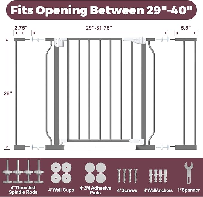 - Adjustable Baby Gate for Doorways: With an adjustable width from 29 to 40 inches, the baby gate with door fits most standard doorways and stair openings, creating a safety environment for your little ones and furry friends while giving you peace of mind.