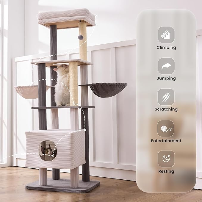 Gardner Pet 65in Heavy Duty Cat Tree Tower for Large Cats, Multi-Level Cat Furniture with Replaceable Sisal Scratching Post, Hammock | Extra-Large Platform & Condo Easy to Clean (Corduroy)