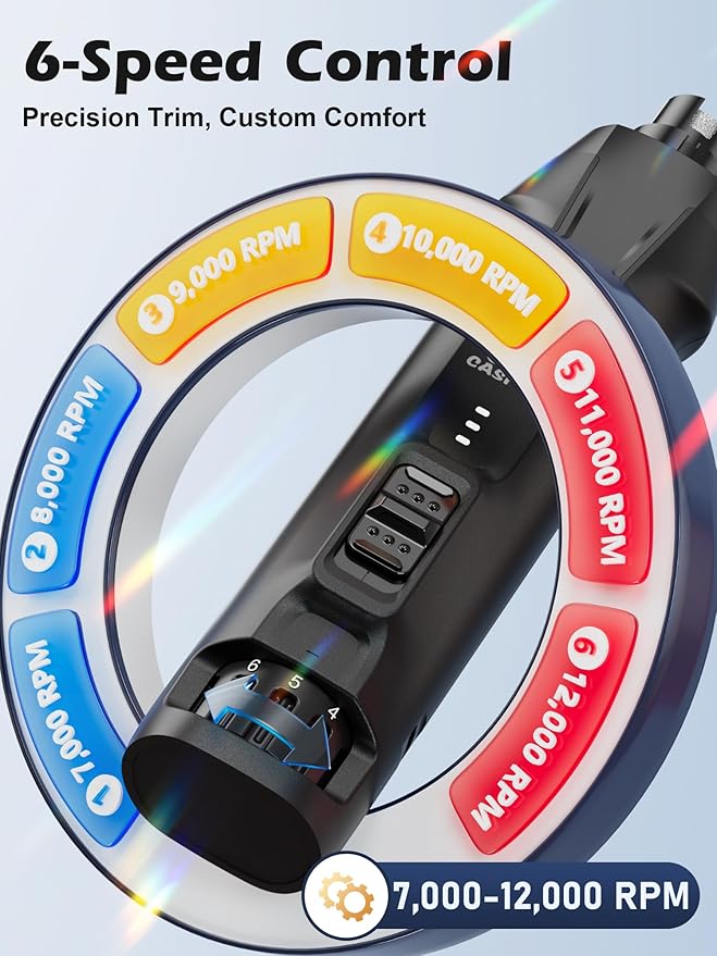 - 【6-Speed Control for Custom Comfort】Adjustable speeds from 7,000 to 12,000 RPM allow you to tailor grinding power based on your pet’s nail size and hardness. Use higher speeds for quick shaping, and lower speeds for precise work near the quick, reducing the risk of discomfort or bleeding. Skip the groomer bills—get smooth, salon-quality results at home with Casfuy dog nail grinder.