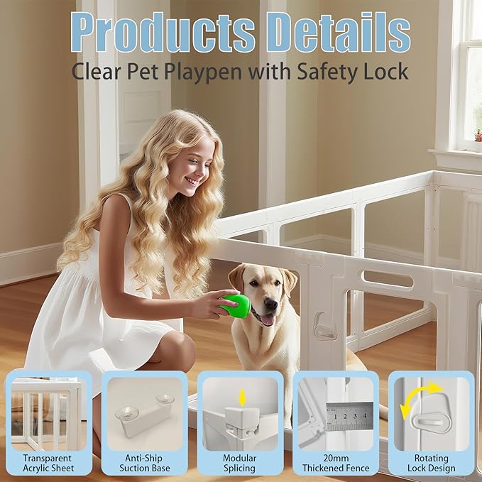 - 【Durable Materials】This dog playpen is made of high quality acrylic and polyethylene material, which is very wear-resistant and durable. 2 cm thick panels prevent pets from scratching and gnawing . The clear acrylic panels allow pets to see their owners without anxiety