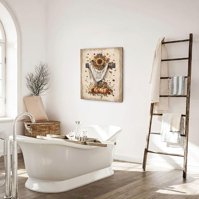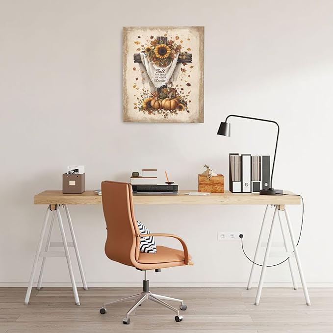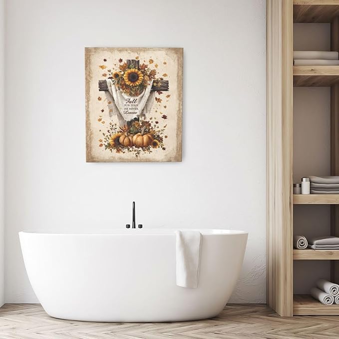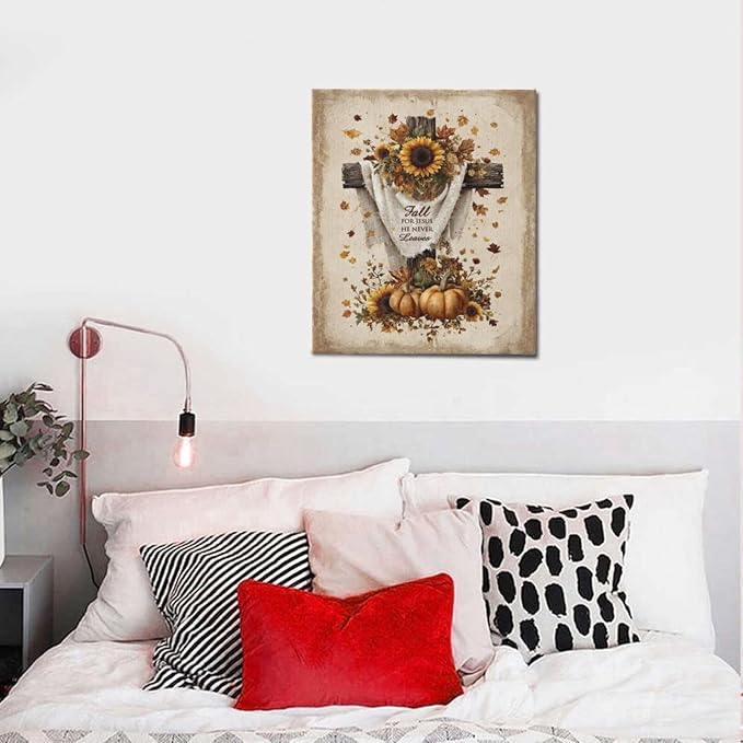 Christian Fall Wall Art Autumn Rustic Cross Sunflower Pumpkin Wall Decor Fall for Jesus He Never Leaves Pictures Painting Print Framed Artwork Decorations Gifts for Living Room Bedroom Prayer Room Office 20"x24"