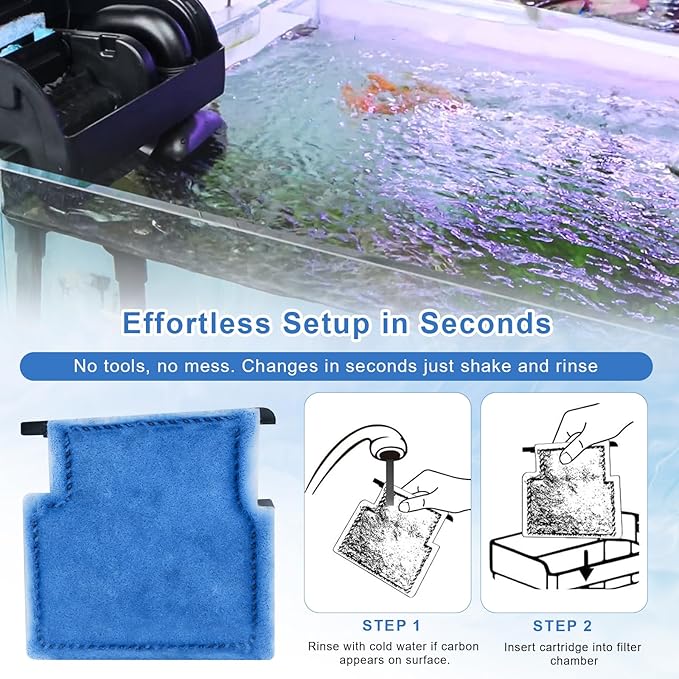 - 【Effortless Setup in Seconds】Slide the pre-assembled fish tank filters cartridges under cool water to rinse away carbon dust, align its keyed base, and push it straight into the aquarium filter chamber until it clicks—done. No tools, no mess, just shake, rinse, and enjoy fresh filtration in seconds.