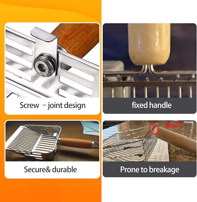 - [Durable 304 Stainless Steel Litter Scoop] Made with 0.7mm thick 304 stainless steel, this cat litter scoop is rust-resistant, sturdy, and long-lasting. The one-piece stamped metal litter scoop design has no weld spots, making it stronger and more reliable than plastic or welded scoops.