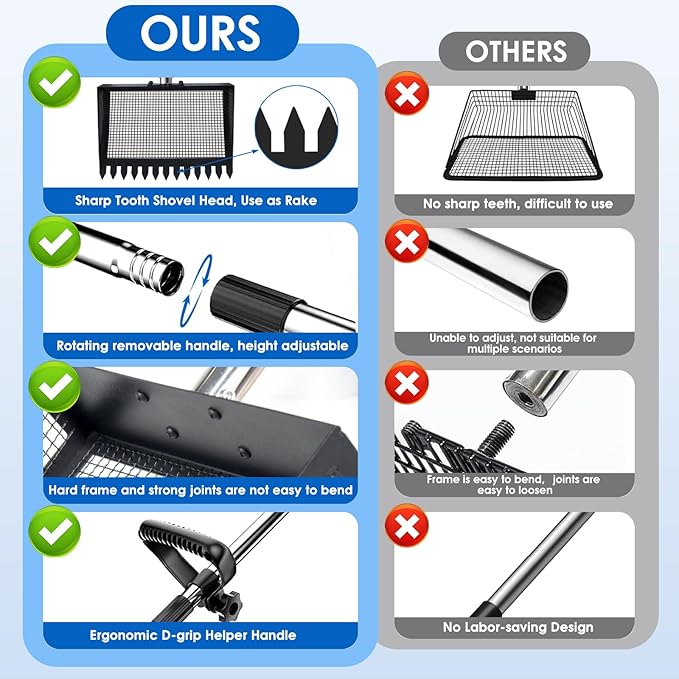 - Sift or Scoop in One:From chicken sand for coop to cat litter, this dual-purpose sifting shovel does it all. Serrations tackle hard messes, while the 0.3-inch mesh makes it a litter scooper, chicken poop scoop, or even a handy sand flea rake for the beach