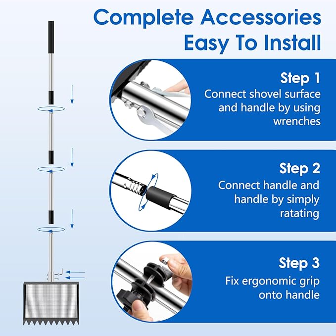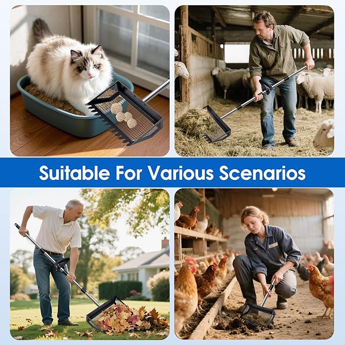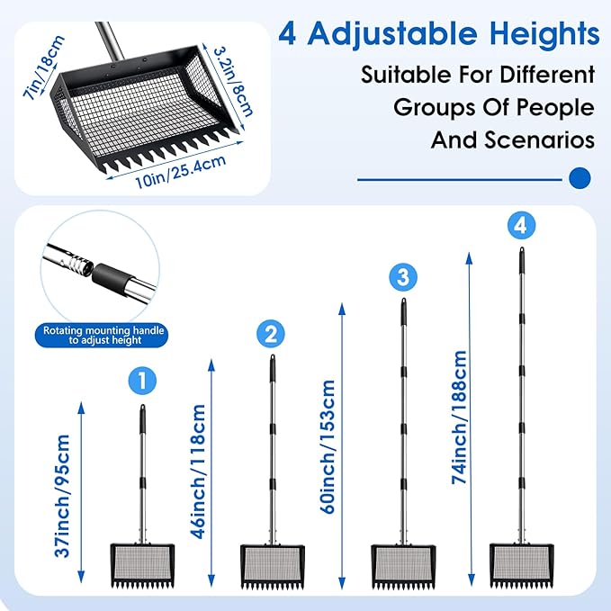 - Height That Fits All:No more bending like a circus act! With four adjustable heights—37in/95cm, 46in/118cm, 60in/153cm, and 74in/188cm—this chicken poop scooper, chicken coop scoop, and sand flea rake adapts to tall, short, or in-between users. Perfect for chicken coop scoop duty while saving your back