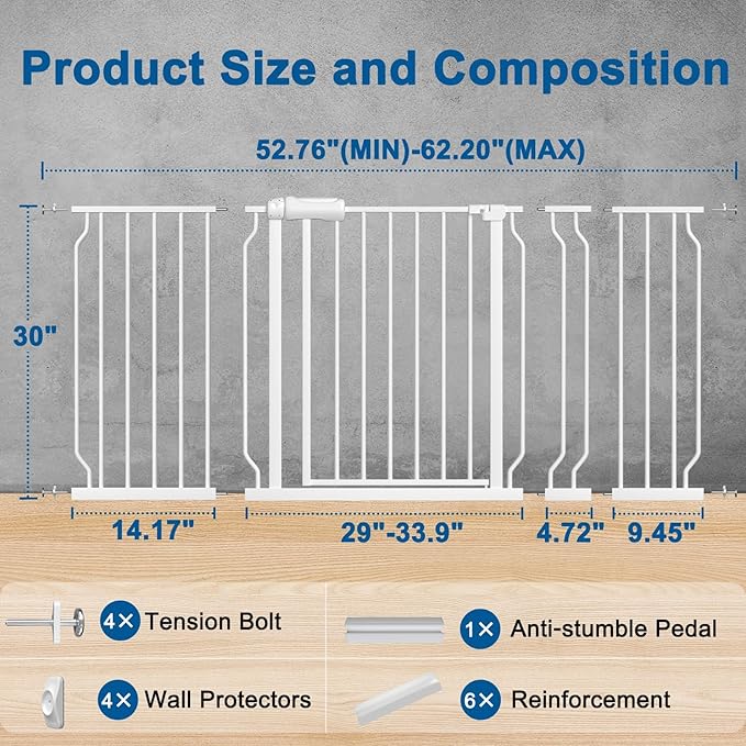 - 【Safe for Baby】Your curious crawlers will be "blocked" by the safety extra wide baby gate because we design the double-lock safety release which makes it difficult for toddlers to open the gate ,but adults can operate with one hand and pass quickly.