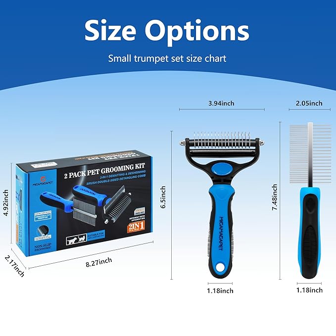- 【Pet Grooming Set】: the set includes a 2-in-1 design de-shedding and shedding brush and a wide-toothed and dense-toothed double-sided comb, suitable for horses, long-haired dogs and all kinds of short-haired cats and dogs, rabbits and other pets' hair grooming, which can better satisfy your needs without having to buy separately, and it's the best combination of effective de-shedding and smoothing.