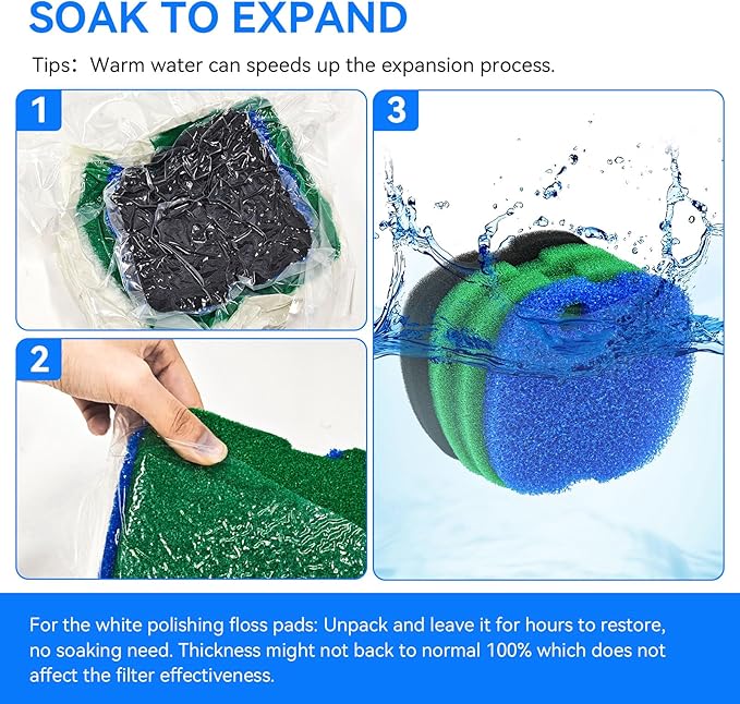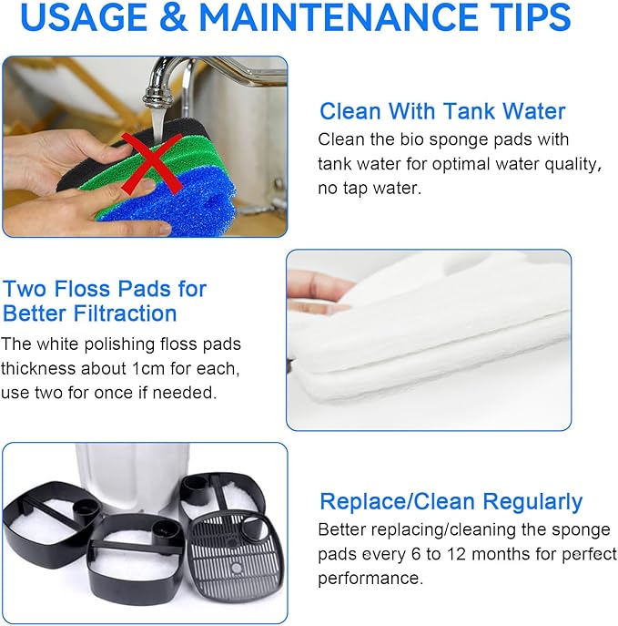 - Tips for Maintenance:✔Replace or rinse sponge pads every 6 to 12 months for optimal performance✔Better replace the white polishing pad every 2 to 6 weeks.✔Resine the bio sponge pads with tank water for optimal water quality, do not use tap water.
