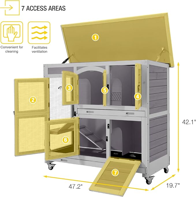 - 𝐖𝐚𝐭𝐞𝐫𝐩𝐫𝐨𝐨𝐟 𝐑𝐨𝐨𝐟 & 𝐌𝐨𝐛𝐢𝐥𝐞 𝐂𝐚𝐬𝐭𝐞𝐫𝐬 - Slanted roof protects against rain, while 360° casters allow easy movement. Ideal for indoor use as a bunny house, ensuring convenience and weather protection