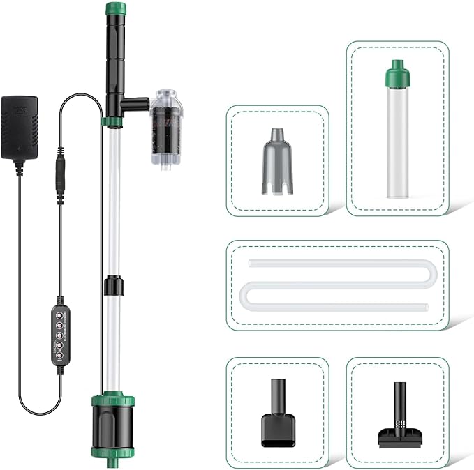 - COMPLETE ACCESSORIES INCLUDE: The electric gravel vacuum for aquarium cleaning kit includes everything you need: 2 Sand washing tubes (for coarse and fine sand), a Sucking manure head, an Alga cleaning blade, a DC 24V power adapter, a Wired controller, a 1.5m water pipe, an Extension tube, Water filter bucket, User manual(with use steps in detail)